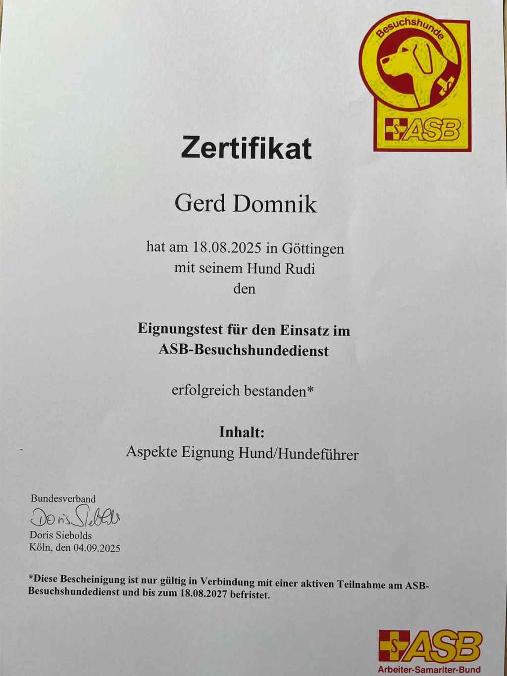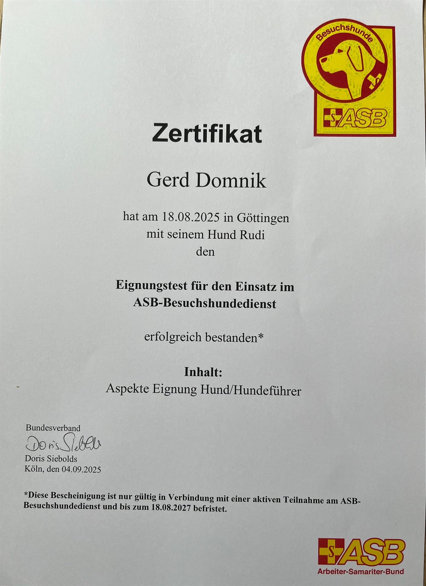 Sie sind Animateure und Schmuser auf vier Pfoten: Die Besuchshunde des ASB. Tiere können sich positiv auf die Psyche von Menschen auswirken. Sie öffnen Herzen und helfen dabei, Erinnerungen zu aktivieren. Das Streicheln eines Tieres wirkt nachgewiesen stressreduzierend und blutdrucksenkend. Vor allem Senioren, Patienten mit Demenzerkrankung, aber auch Kinder mit Entwicklungsverzögerungen oder Menschen mit Behinderung profitieren vom Kontakt mit Tieren. Daher besuchen Zwei- und Vierbeiner vom ASB OV Göttingen Stadt Menschen in verschiedenen sozialen Einrichtungen der Stadt Göttingen und Umgebung. In einem Eignungstest wird der Hund auf seine soziale Verträglichkeit gegenüber Menschen aber auch anderen Hunden sowie auf seine Ausgeglichenheit in verschiedenen Situationen geprüft.