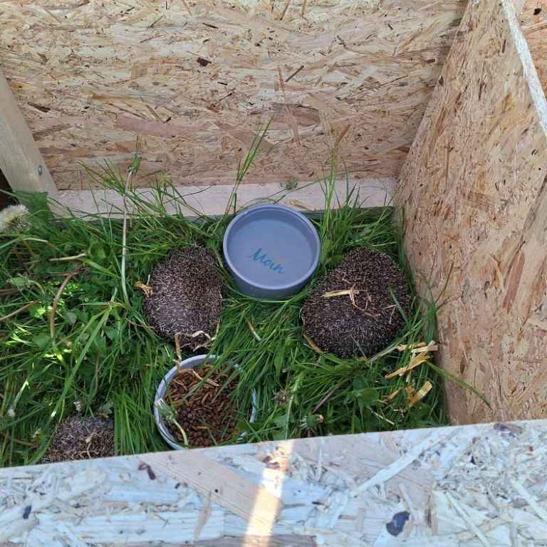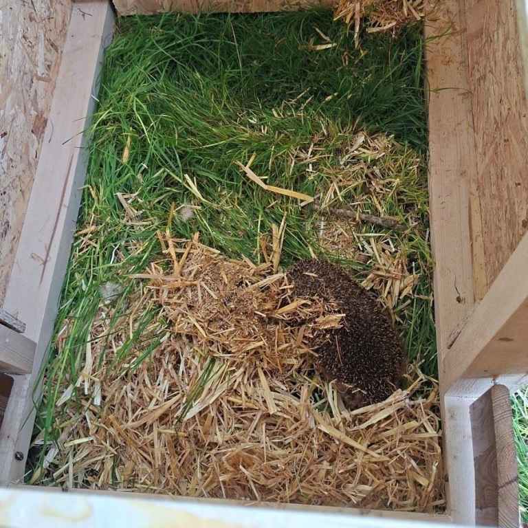 Alle sechs Igel sind wohlauf und haben gut zugenommen. Wir haben einige gute Tipps erhalten und haben daraufhin noch kleine Veränderungen vorgenommen. Die Igel haben jetzt Pappkartons zum schlafen mit Stroh gefüllt. Als Einstreu nehmen wir jetzt Strohfix. Das ist sehr fein und saugt gut die Pippi auf, lässt sich kompostieren und wickelt sich nicht um die Beine der Igel.