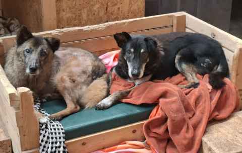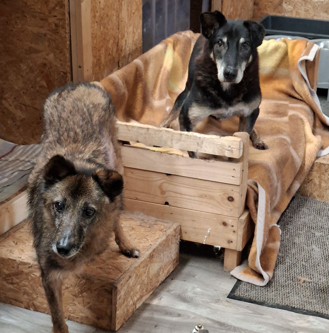 " Fred und Barney " die beiden Hunde waren in Rumänien mit unserer Nelly und Lotte in einem dunklen Zwinger untergebracht. Viele Jahre, bis die Kollegen von "Vierbeiner in Not" die vier Hunde entdeckten und in eine Pension brachten. Wir wurden gefragt ob evtl. Fred und Barney auch zu uns dürften, wenn ein Plätzchen frei wird. Da sie alt und scheu sind, gibt es kaum Plätze hier in Deutschland. So kamen die zwei Burschen zu uns. Nun bekommen sie alle Zeit der Welt um ihr Leben zu genießen. Bei uns verlangt niemand etwas von Ihnen und sie dürfen einfach nur Hund sein. Barney, der braune, ist etwas mutiger. Fred der dunkle hat schlimme Spondylose und Arthrose und bekommt Schmerzmittel und Gelenktabletten zur Linderung und die tun ihm gut.